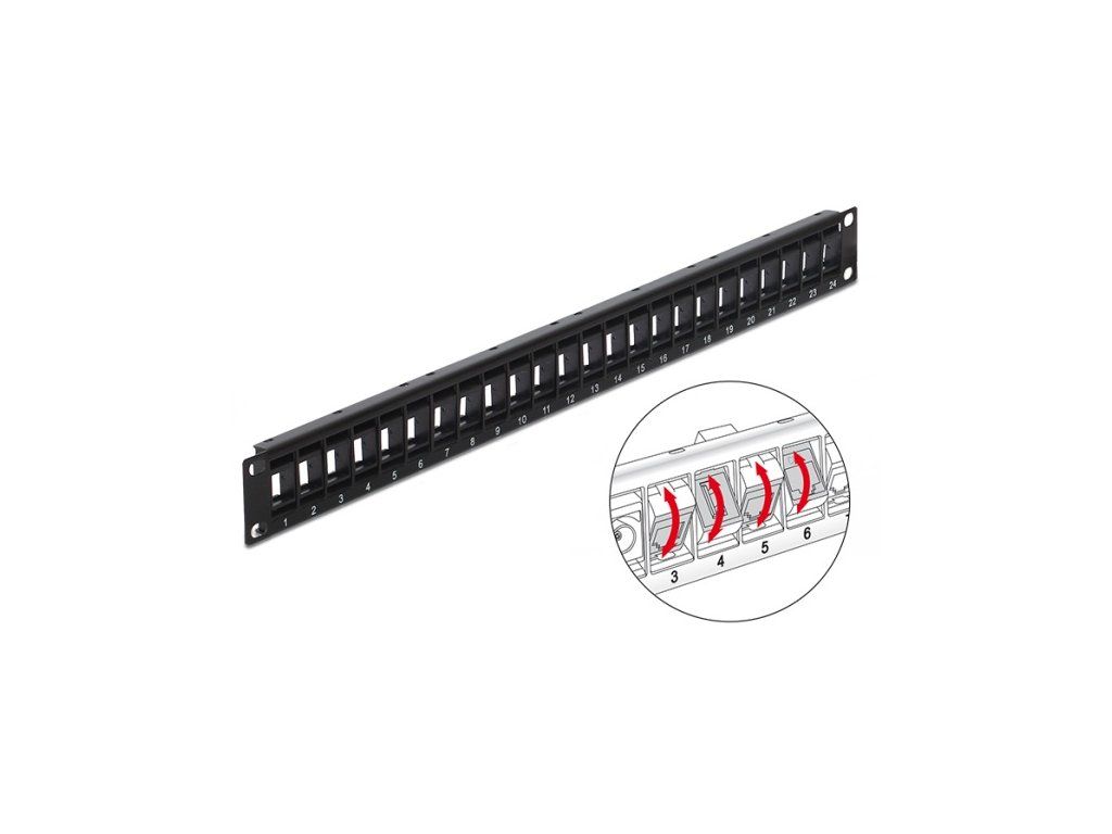 This Patch Panel by Delock can be mounted in a 19” rack. The rotatable Keystone ports allow for an angled and space saving installation of cables. With its standardized dimensions, the panel is suitable for easy snap-in mounting of 24 Keystone modules.• 2